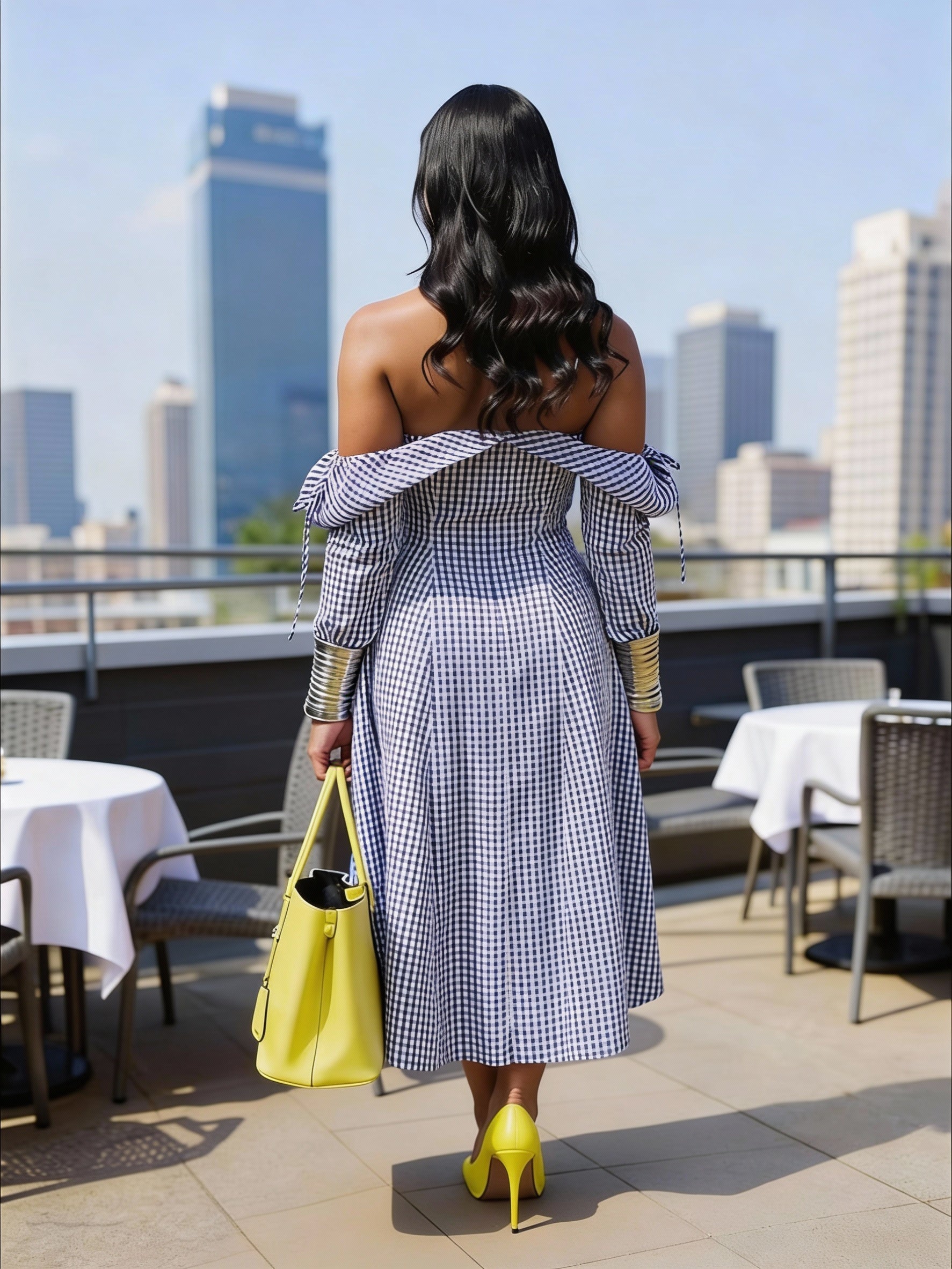 Introducing our High-Low Cold Shoulder Checkered Print Flare Dress, a chic and contemporary addition to your wardrobe that effortlessly combines classic patterns with modern design elements