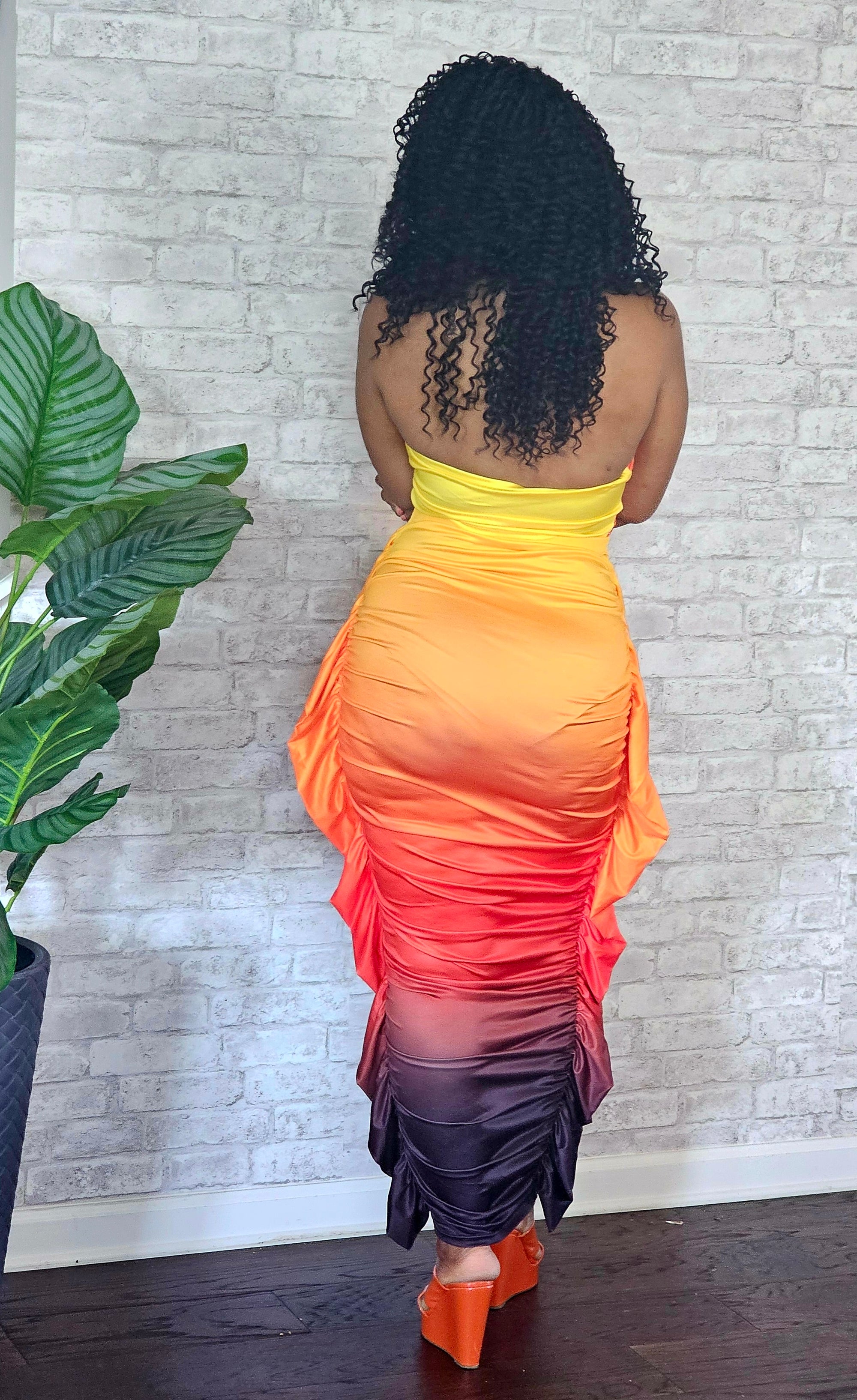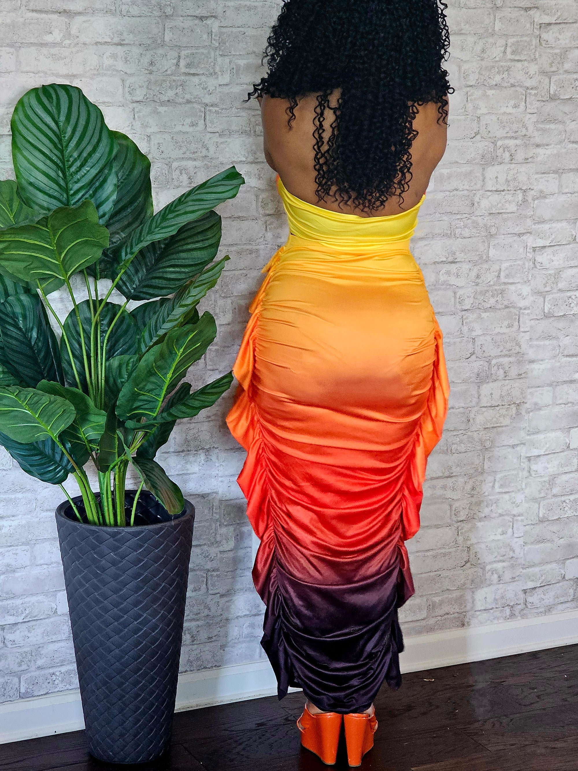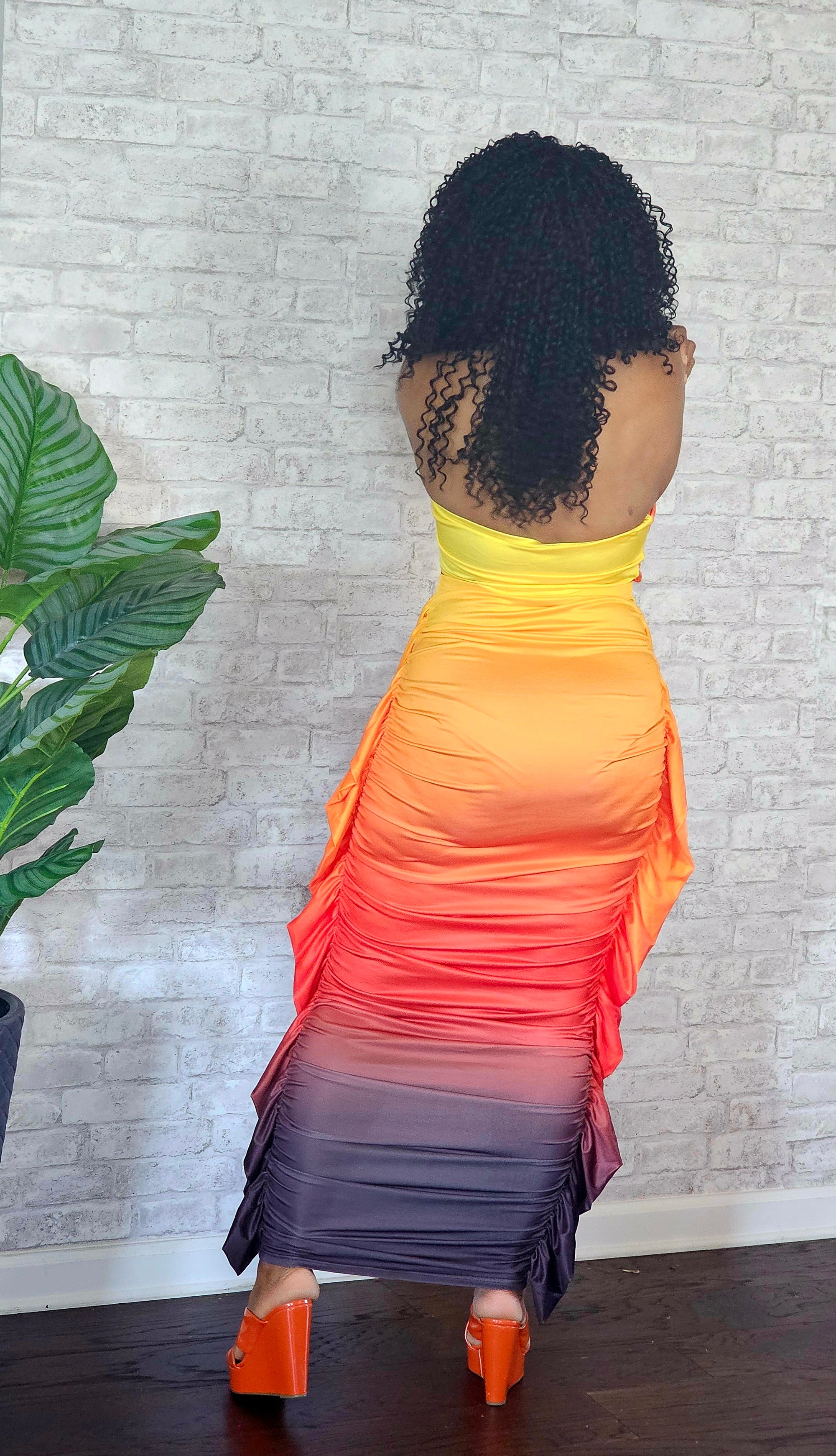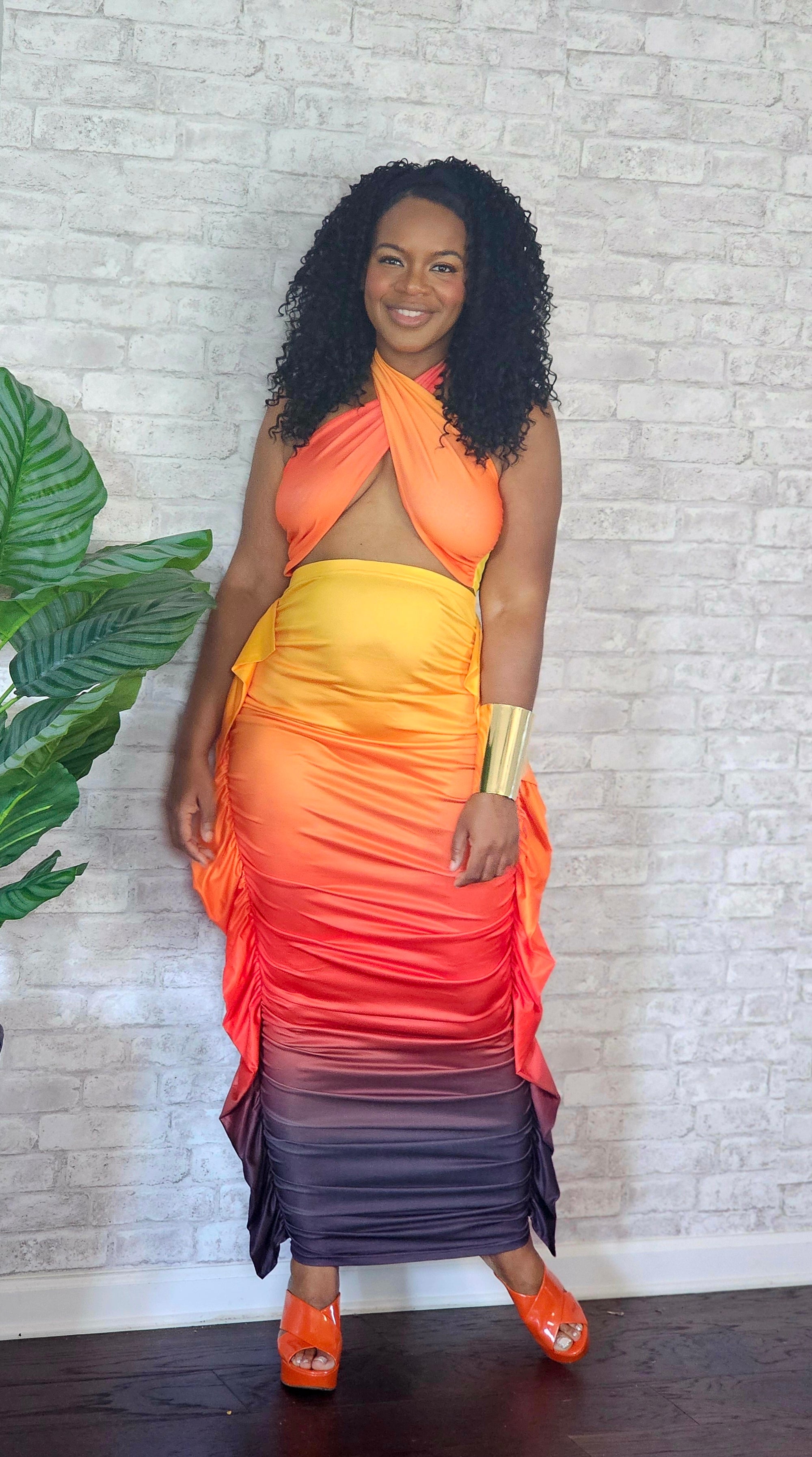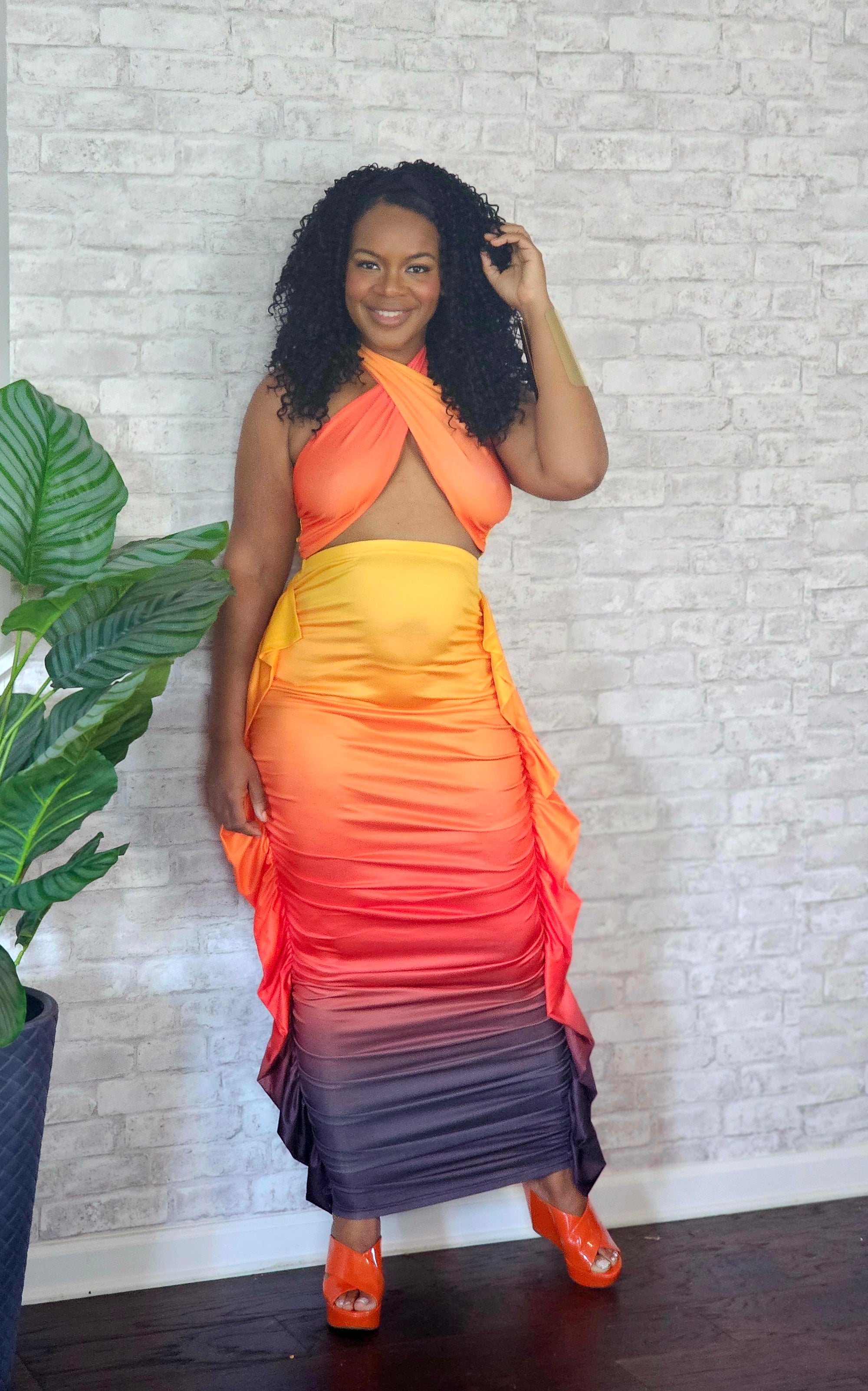 Radiate sunshine and style in this vibrant two-piece set featuring a halter crisscross top paired with an ombré skirt. The top wraps and ties for a secure, flattering fit, showing off the shoulders and adding a touch of bold flair. The long skirt cascades in a stunning yellow-to-orange gradient, creating a warm, eye-catching effect with every step. Perfect for vacations, beachside dinners, or summer events, this set brings effortless beauty and tropical vibes to your wardrobe.